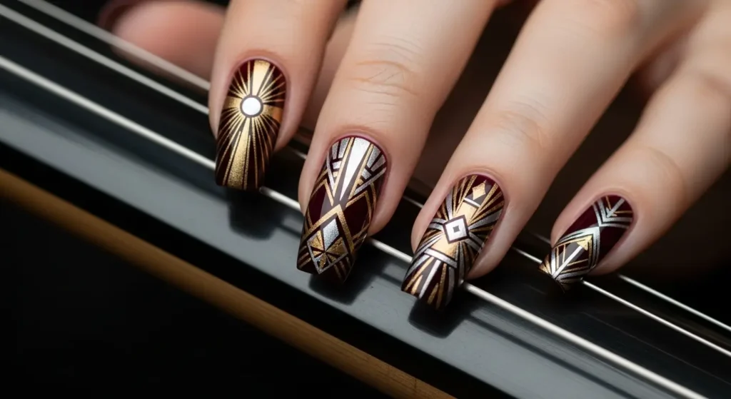 Sharp geometric patterns in antique gold adorn a burgundy base. It brings Roaring Twenties glamour to your holiday.