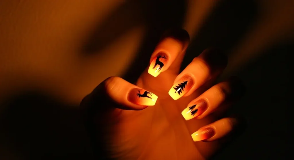 Nails glow with a candle flame gradient under a black silhouette. It captures the warm drama of the season.
