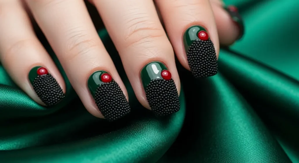 An emerald base is covered in matte black microbeads. A single red bead adds a pop of textural contrast.