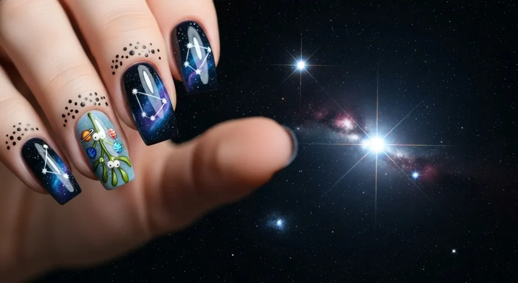 A galaxy manicure where mistletoe has planetary berries. Perfect for a celestial holiday celebration.