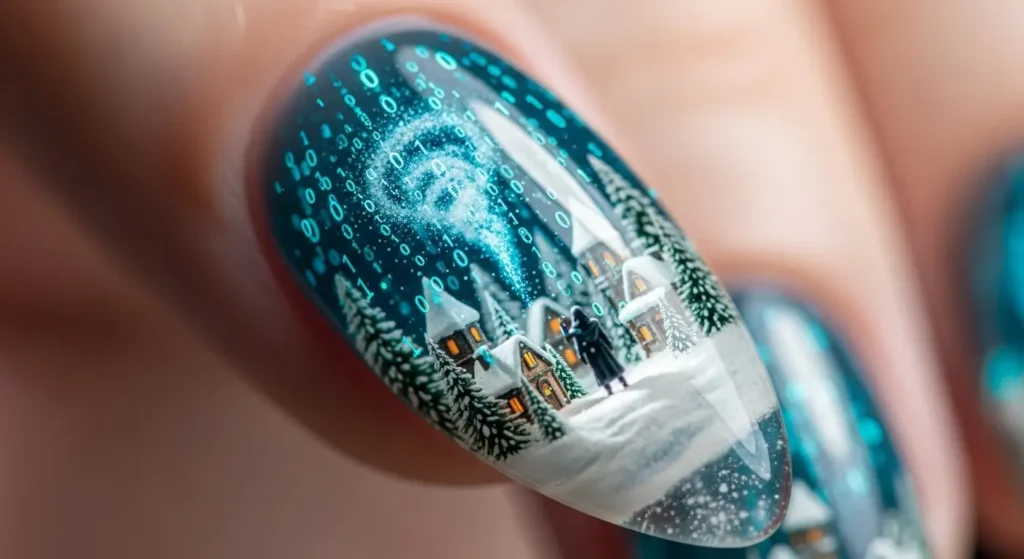 A tiny winter village sits under a clear gel dome with a snowstorm of glowing binary code. It is a tech lovers perfect holiday manicure.