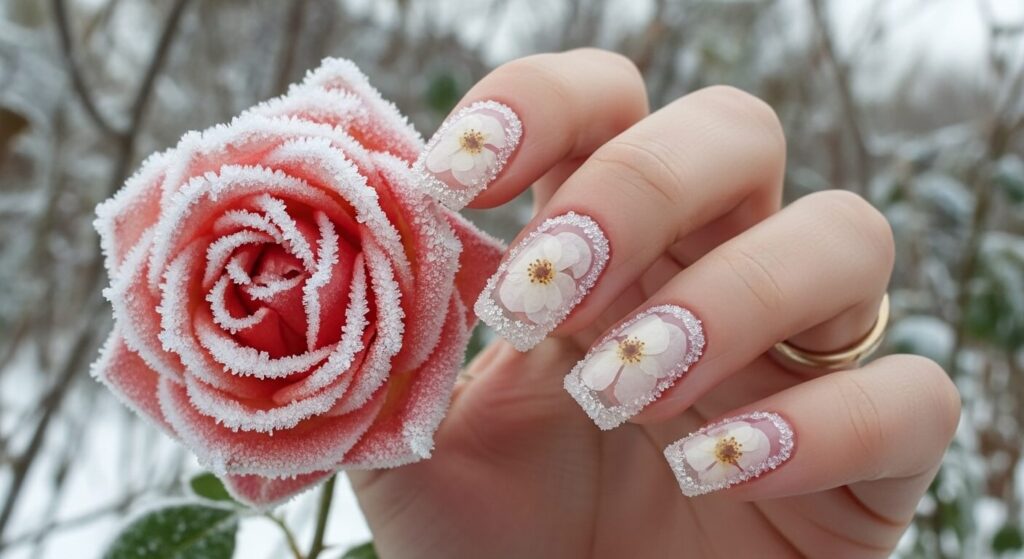Pressed white flower petals are frozen under a layer of crystalline polish. It is a delicate and ethereal winter look.