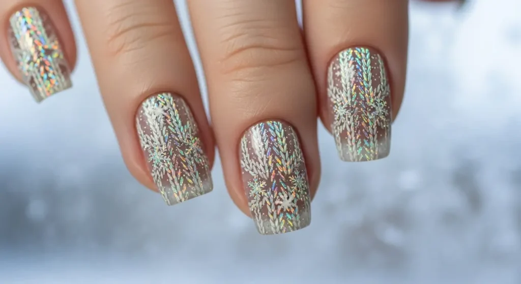 Glowing Scandinavian knit patterns are made from holographic fiber optics. This futuristic christmas nail design catches light like a prism.