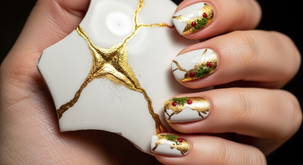 Cracked white ceramic nails are repaired with seams of gold leaf. This design finds beauty in holiday imperfection.
