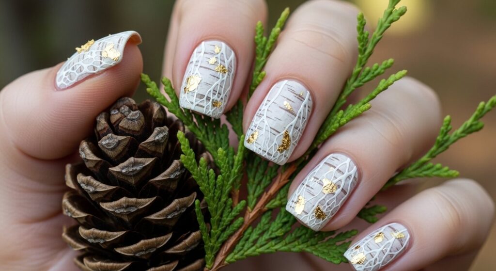 Glowing fungal networks spread across a birch bark base. This organic christmas nail design connects your nails into one ecosystem.