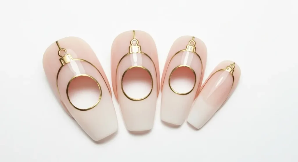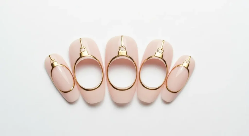 The bauble shape is your natural nail outlined in gold. A minimalist and elegant christmas nail design.