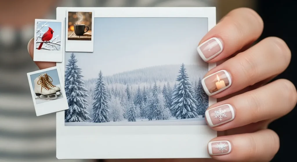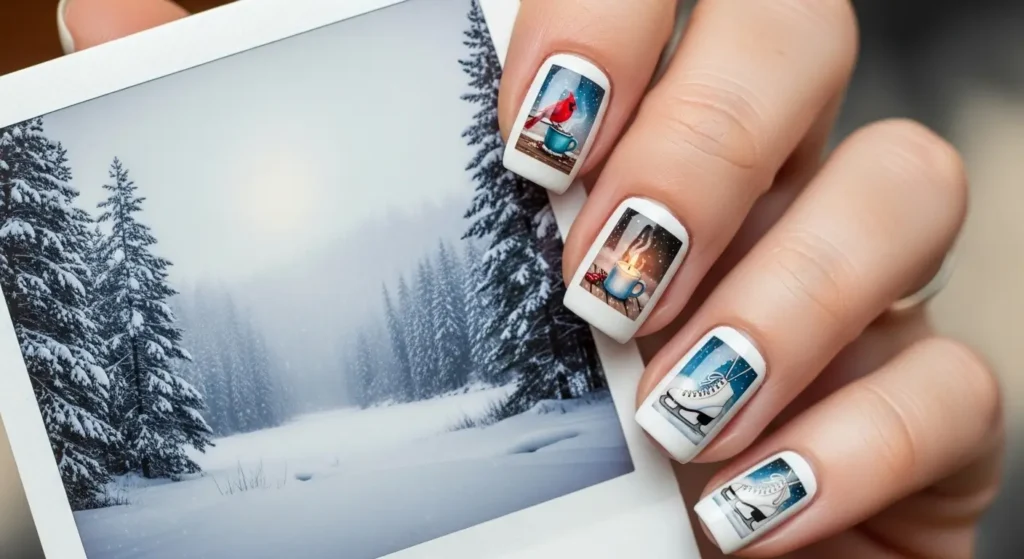 Each nail is a Polaroid frame holding a tiny winter scene. A nostalgic and storytelling manicure.