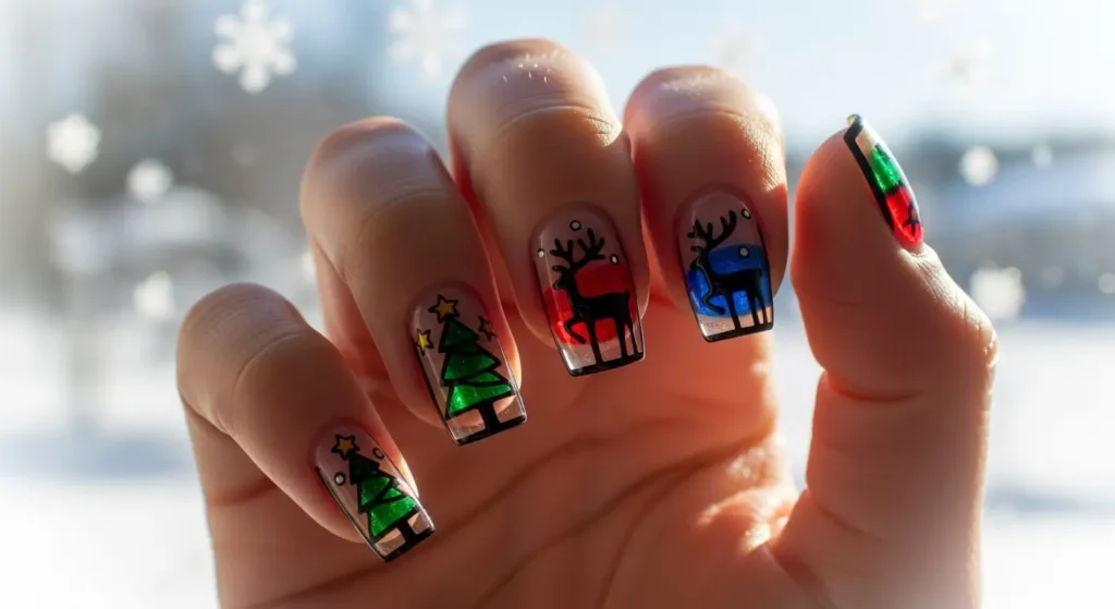 Use nail stickers (bows, snowflakes), create simple candy cane stripes, or try a glitter ombrรฉ effect with a makeup sponge.