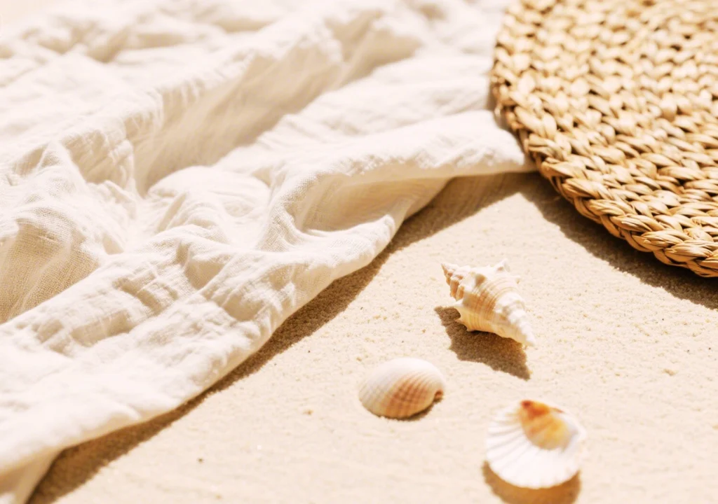 - Texture: Crinkled linen, nubby raffia, sun-bleached leather