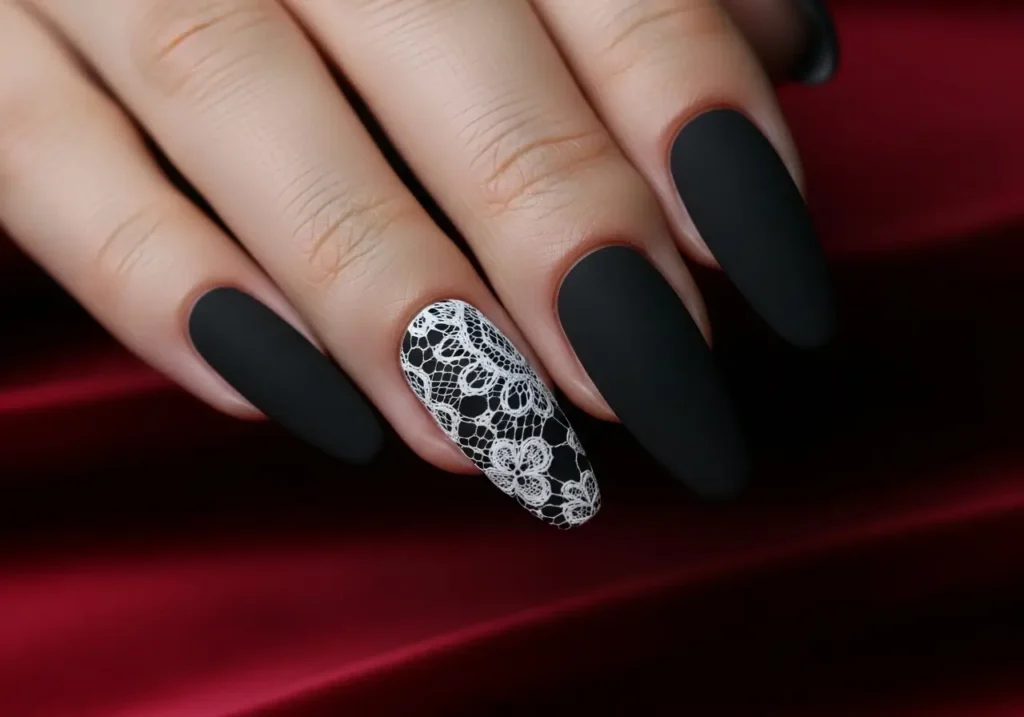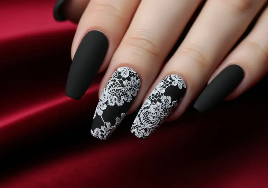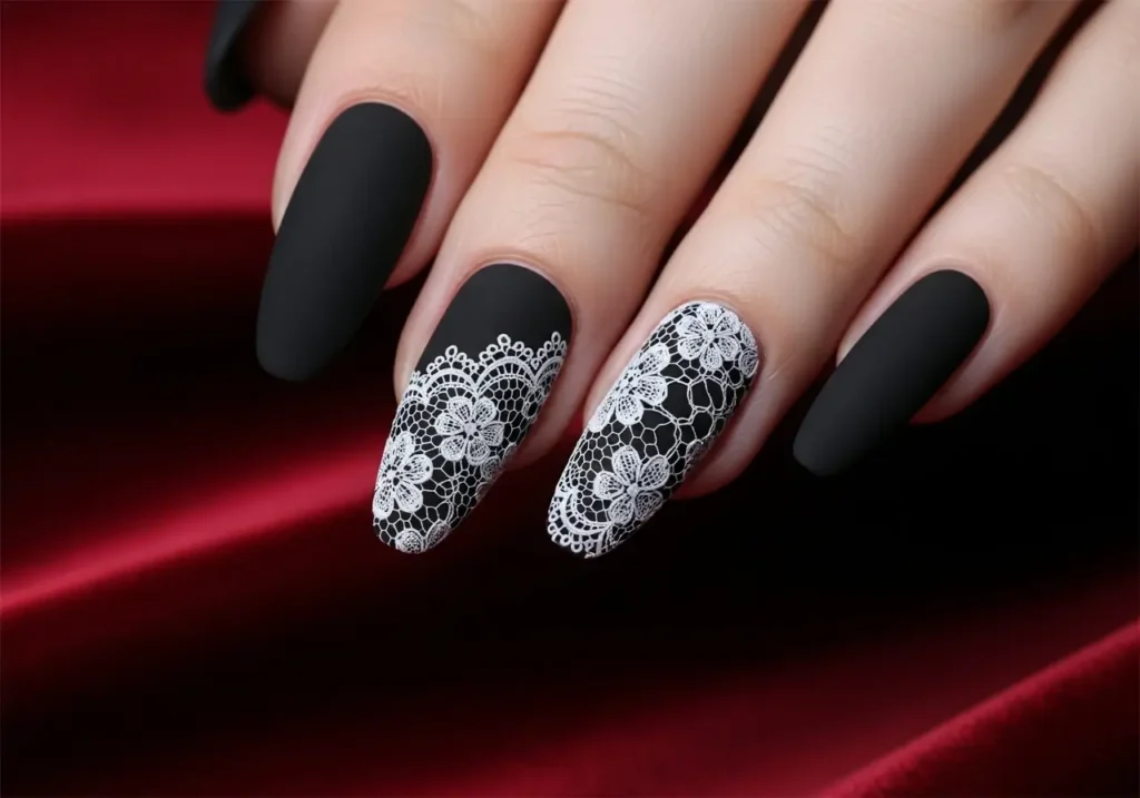 Dramatic and romantic, this design features a matte black base with a delicate, intricate white lace appliqué laid over it.
