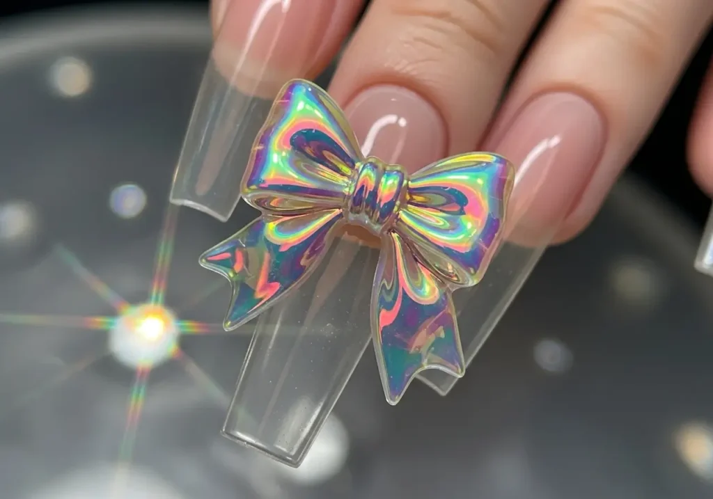 A delicate, 3D sculpted gel bow with a shifting iridescent film that catches the light, placed on a transparent nude base.