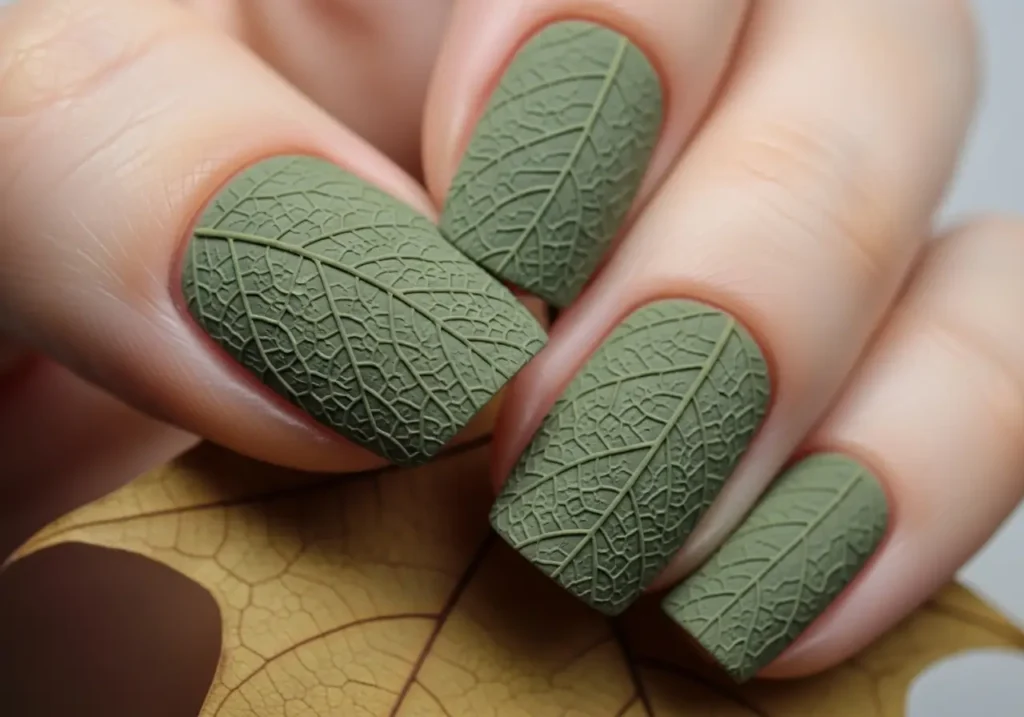 A subtle, organic design where the surface of the nail has raised ridges that mimic the intricate vein structure of an autumn leaf.
