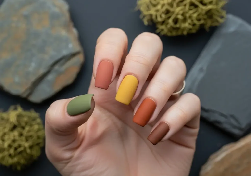 A curated, cohesive yet playful set where each nail is a different solid, creamy color from an earthy palette.