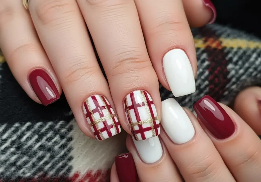 A preppy and perfect autumn design, featuring a glossy burgundy base with a single, precise plaid-patterned accent nail.