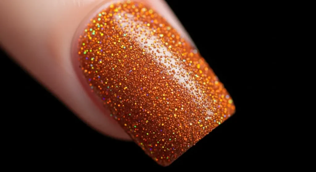 Fully textured nails with a base of cinnamon-colored polish packed with fine holographic glitter, mimicking the effervescence of sparkling cider.