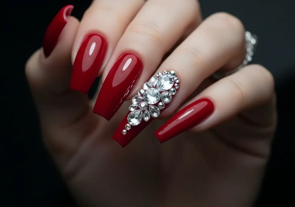 A bold, classic cherry red gets a modern update with a single, long coffin nail adorned with a cluster of clear rhinestones.