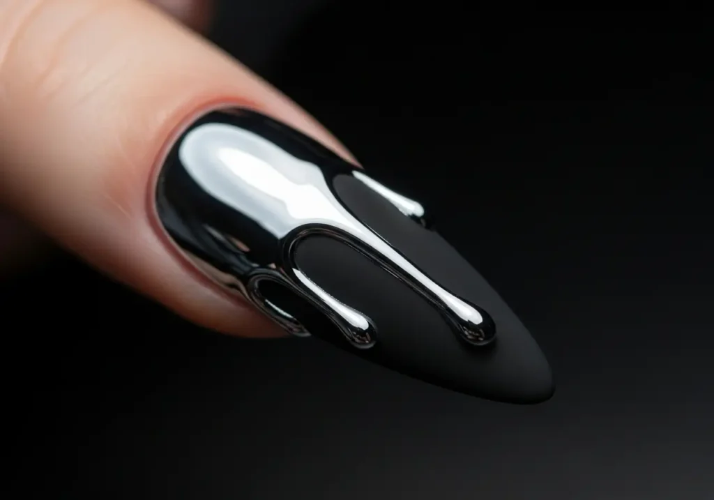 An abstract and edgy design where shiny, liquid-like silver chrome appears to drip down over a matte black base.