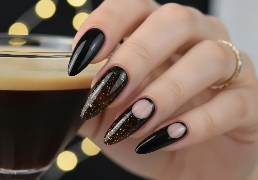 Capturing the essence of the cocktail, this design features a deep brown base, gold glitter flakes, and a glossy black half-moon tip.