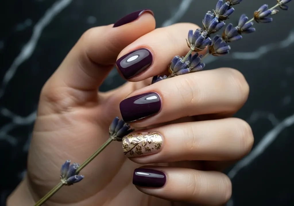 A rich, glossy eggplant shade is elevated with a single accent nail featuring delicate, hand-painted gold leaf vines.