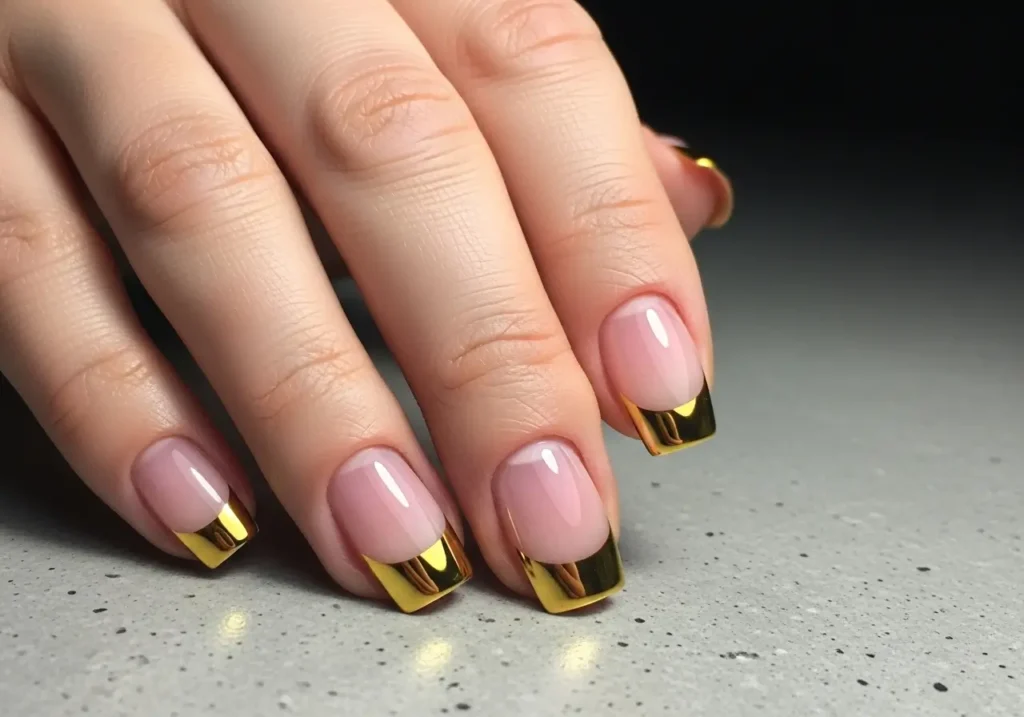 The ultimate modern minimalist manicure: a sheer base with a razor-thin French tip made of reflective liquid gold chrome.