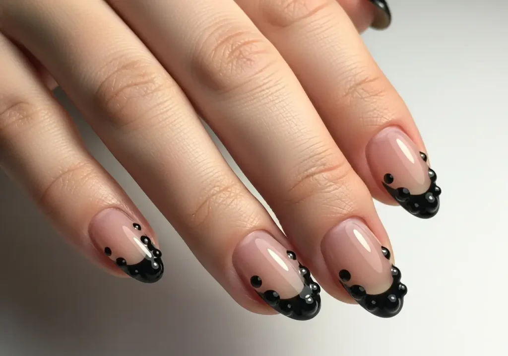A playful twist on the classic French manicure, using 3D glossy black dots on a sheer nude base.