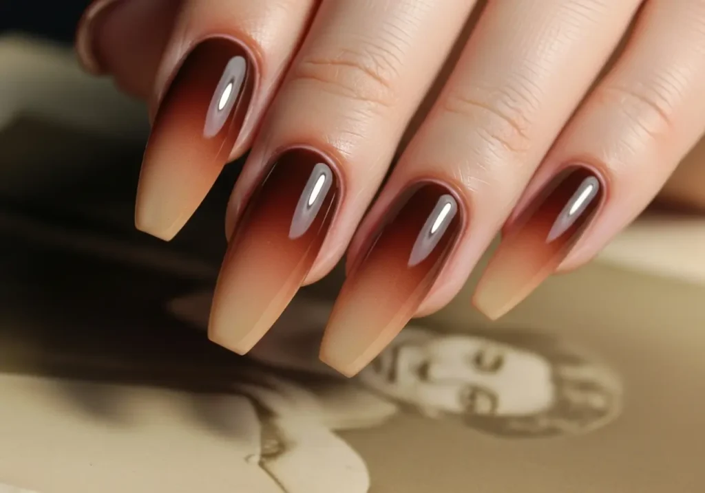 A smooth, gradient fade from dark brown to soft sepia, finished with a high-shine “glazed donut” top coat for a liquid look.
