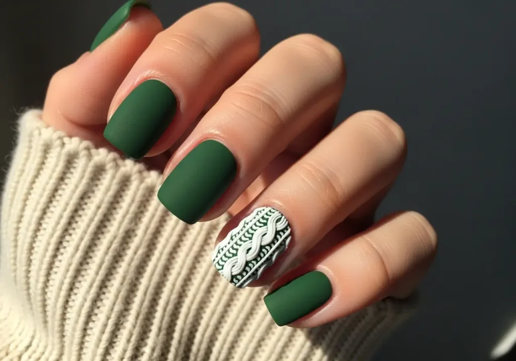This design literally brings the texture of a cozy knit sweater to your nails with a raised, cable-knit pattern on a matte forest green base.