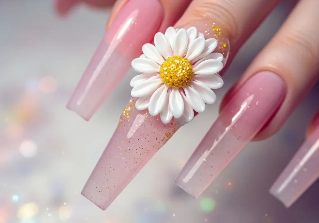 A nod to the Y2K revival, this design features a translucent pastel base and a single, sculpted 3D pearl daisy with a glitter center.