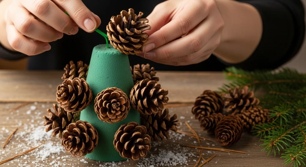 Head into your backyard or a local park to gather pinecones. Attach them to a foam cone using wired floral picks or a little hot glue. This project builds a beautiful, woodsy tabletop tree that brings natural charm indoors. For an extra festive touch, add a tiny sprinkle of faux snow or a miniature star on top.