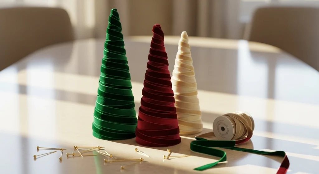 For a touch of luxury, make these elegant velvet trees. Wrap a foam cone with wide velvet ribbon, working from the bottom up and securing it with T-pins as you go. Hide the pins under the layers of ribbon. Finish with a small ribbon bow at the top for a classic look. They make a beautiful centerpiece.