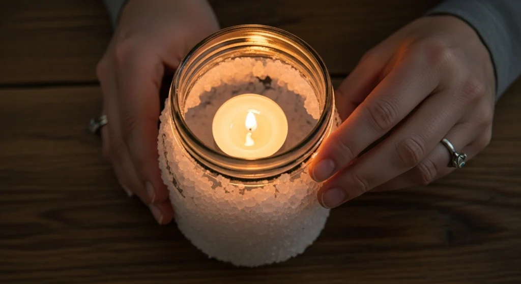 Grab a mason jar, some Mod Podge, and textured Epsom salt. Simply brush the outside of the jar with Mod Podge and roll it in the salt to create a gorgeous, frosty effect. Place a tea light inside, and in under 15 minutes, you have a glowing, winter-ready luminary for your mantel or table.