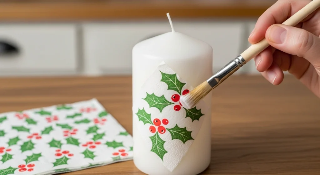 Have pretty holiday napkins on hand? You can decoupage their designs onto plain pillar candles for a custom look in minutes. This budget-friendly decor hack allows you to perfectly match your candles to your existing holiday color scheme and style.
