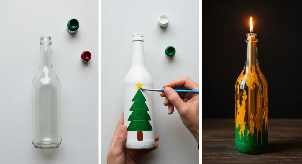 Don’t toss those glass soda or juice bottles! With a little craft paint, you can transform them into charming, modern Christmas candle holders designed to look like trees. This is a fantastic way to upcycle and create unique decor. They look especially lovely with flickering taper candles.