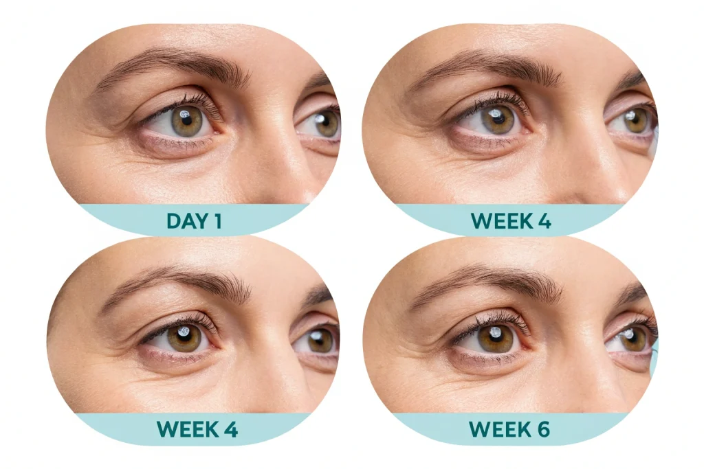 - Week 4: Dark circles faded 40% – the greyish tinge vanished. Outer eye lines looked softer, like someone gently ironed them. My sister asked if I’d gotten “baby Botox.”